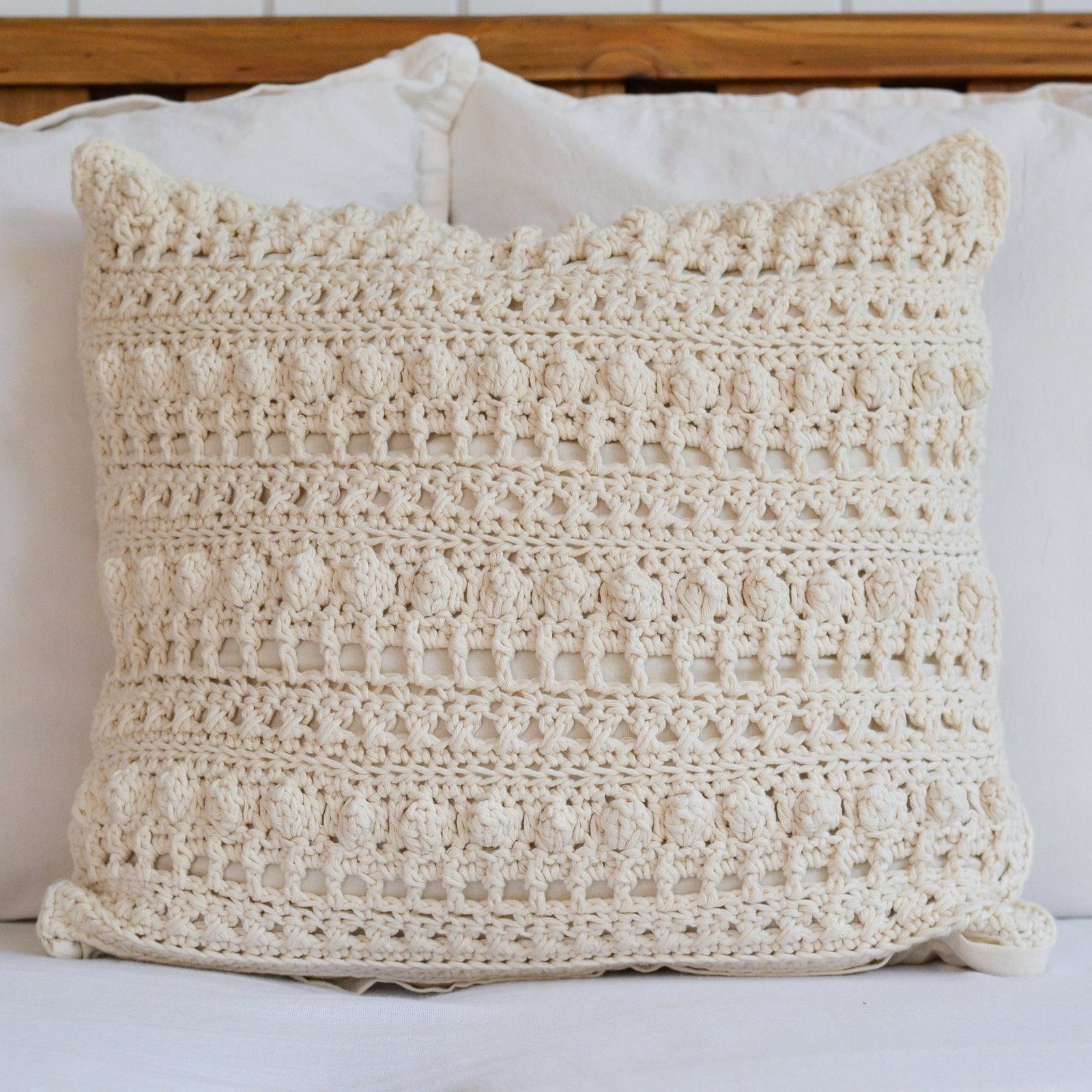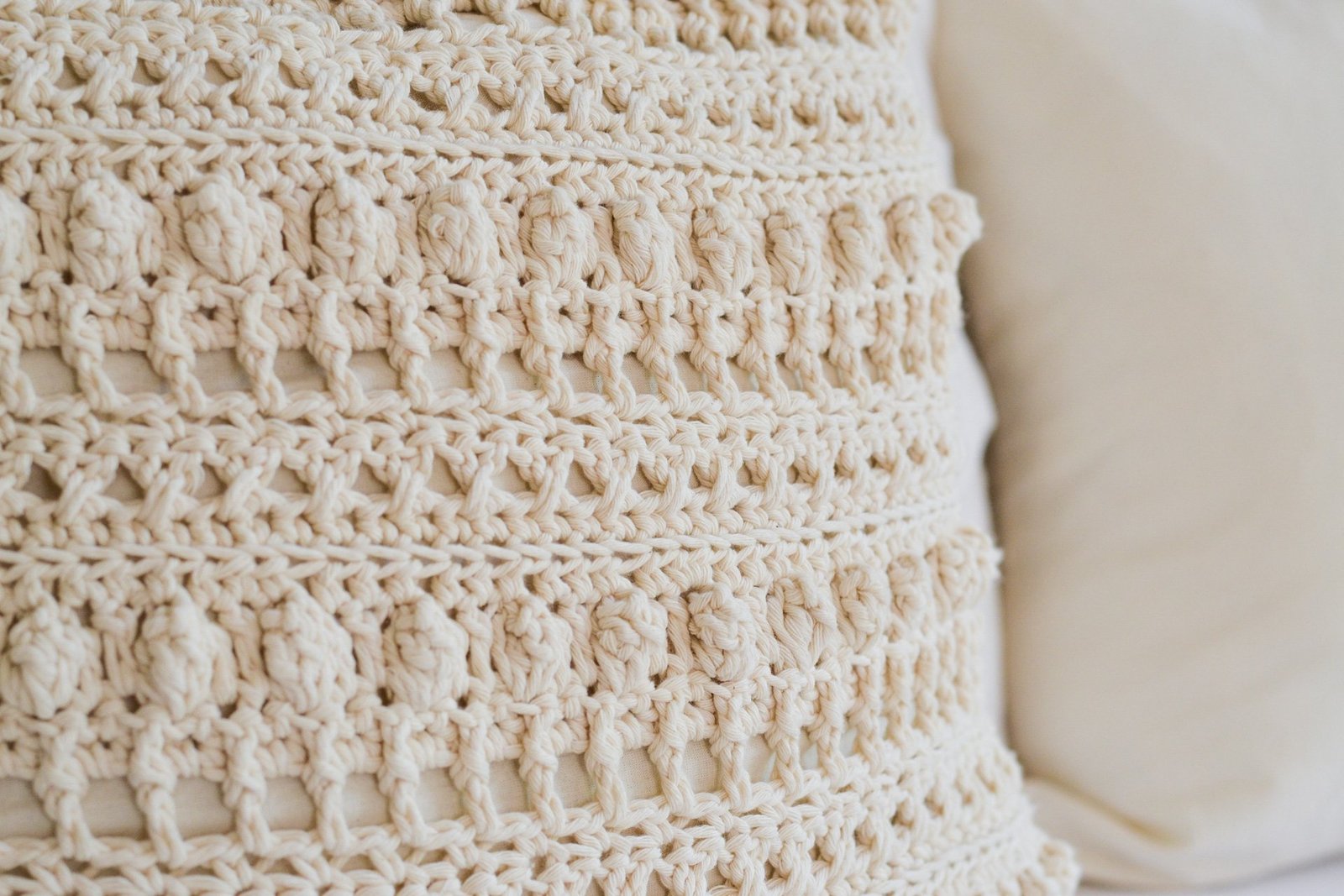 - La funda es de lienzo de algodón en su parte trasera con el frente tejido a crochet con un diseño bohemio que aporta textura y calidez a cualquier espacio (*).