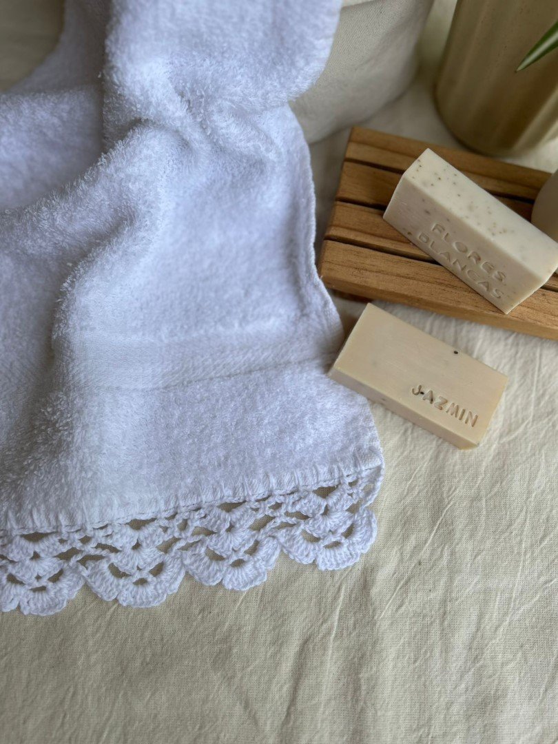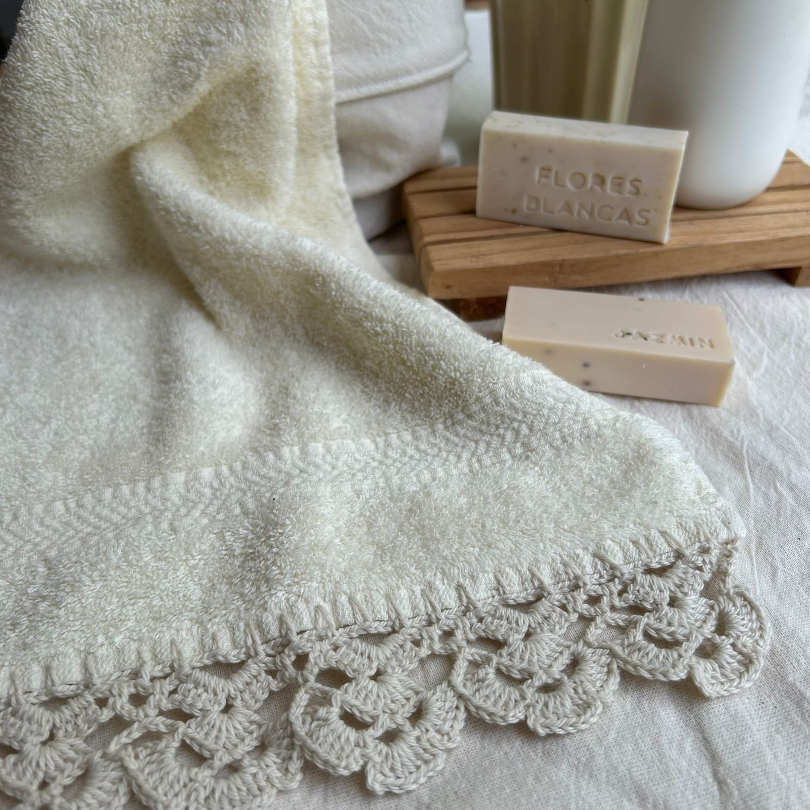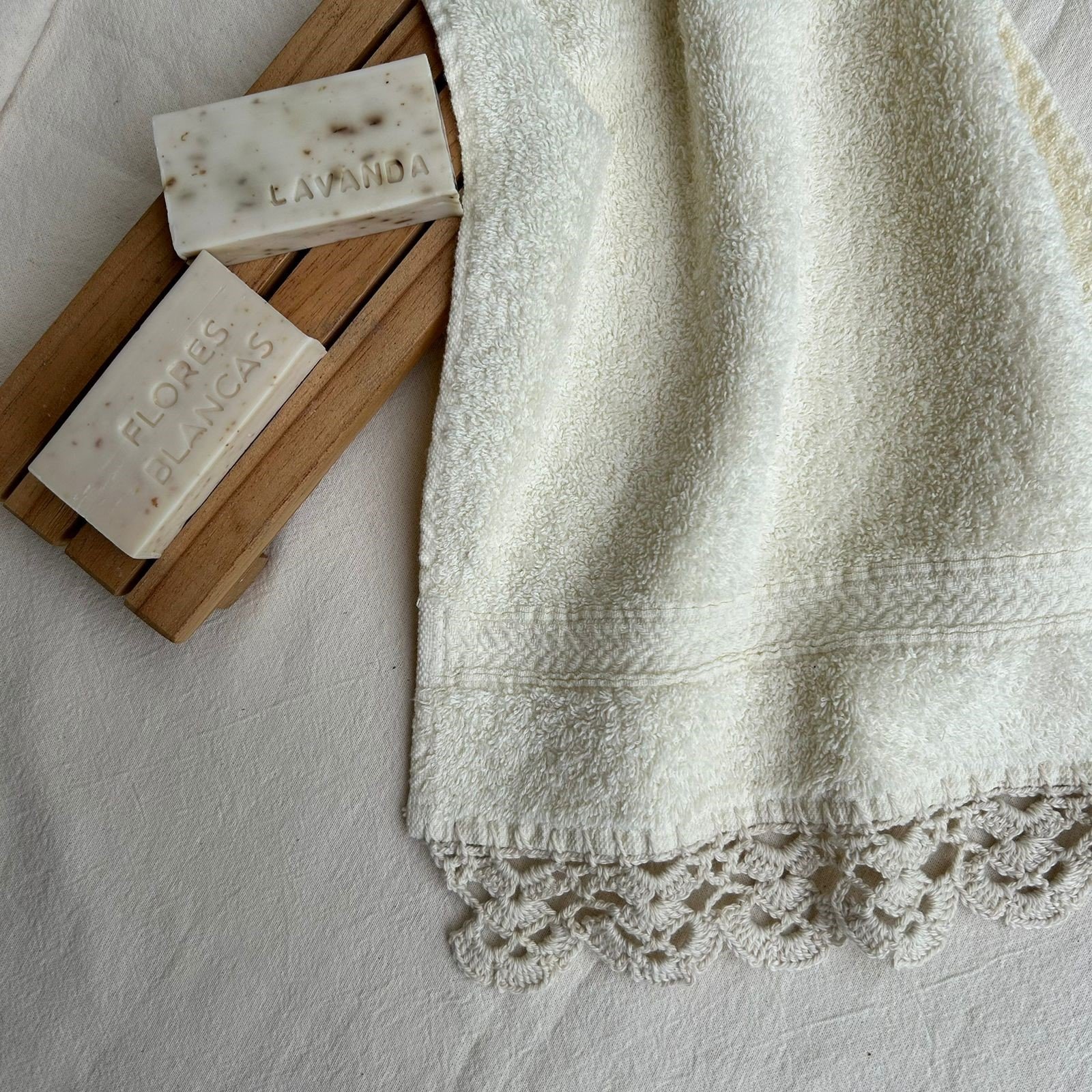 • Toallita de visita 100% algodón con puntilla tejida a mano.